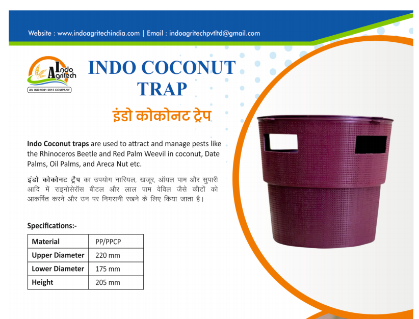 Coconut farmers across India face serious yield losses due to destructive pests. INDO COCONUT TRAP, developed by INDO AGRITECH PRIVATE LIMITED, offers an effective, eco-friendly, and farmer-trusted solution to protect coconut plantations and improve productivity.