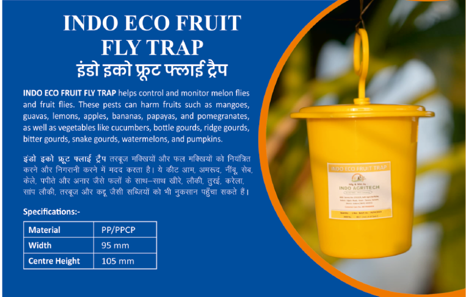 Fruit fly infestation can severely reduce crop quality and farmer profits. INDO ECO FRUIT FLY TRAP is an eco-friendly, highly effective solution designed to control fruit flies in orchards and farms across Indiaβs diverse agro-climatic regions.