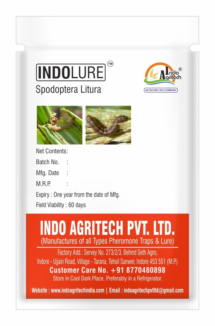 INDO LURE ™ – Pheromone Lure for Tabacco Caterpiller (Spodoptera Litura) 📋 Product Description (with Key Features): 🐛 Target Pest: Tabacco Caterpiller (Spodoptera Litura) – a highly invasive pest affecting soybean, groundnut, cotton, tomato, cabbage, okra, and other vegetables. 🌿 Type: Sex pheromone lure for species-specific male moth attraction. 🧪 Mode of Action: Attracts male moths to trap, interrupting reproduction cycle. 📦 Packaging: Hermetically sealed aluminum foil pouch to retain potency. ⏳ Shelf Life: 12 months under recommended storage conditions (cool & dry place). 🌱 Application: Use with Funnel/Pheromone traps in affected crop fields. ⚖️ Trap Density: 15-20 traps per acre based on infestation level. 🔄 Replacement Cycle: Replace lure every 45–60 days for best results. 💡 Key Benefits: Early detection and effective monitoring/control of Tabacco Caterpiller. Reduces need for chemical pesticides and lowers crop residue. Eco-friendly, safe for beneficial insects and pollinators. Supports IPM (Integrated Pest Management) initiatives. 🇮🇳 Manufacturer: INDO AGRITECH PVT LTD – Leading innovators in eco-safe pest control solutions